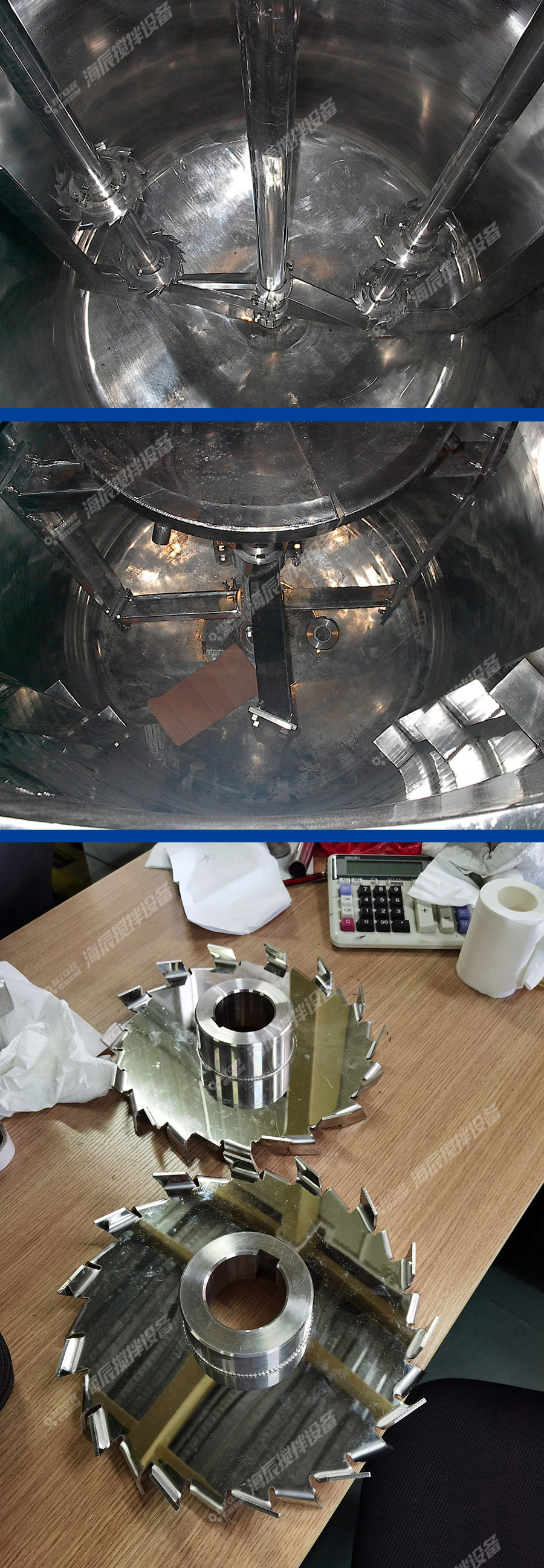 物料在鋸齒狀圓形分散盤葉片的高速轉動作用下,在容器內上下劇烈翻動,與葉片及其他物料分子產生碰撞和剪切,使聚集體達到迅速分散,均質混合乳化,加速溶解。
